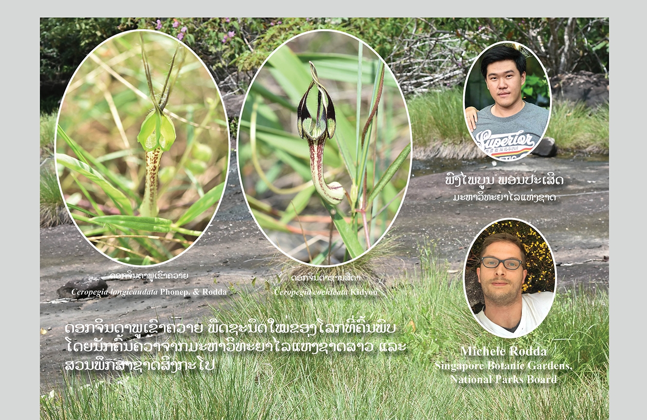 A newly discovered species from central Laos, Ceropegia longicaudata, is here described and illustrated. It is compared with the morphologically similar species Ceropegia cochleata Kidyoo. Ceropegia longicaudata displays clear differences in the leaf pubescence and venation, length of the corolla lobe tips, colour of corolla lobe, and shape of staminal corona lobes. Ceropegia cochleatais newly recorded for the Flora of Laos. A key to the now three species of Ceropegiain Laos is also provided.