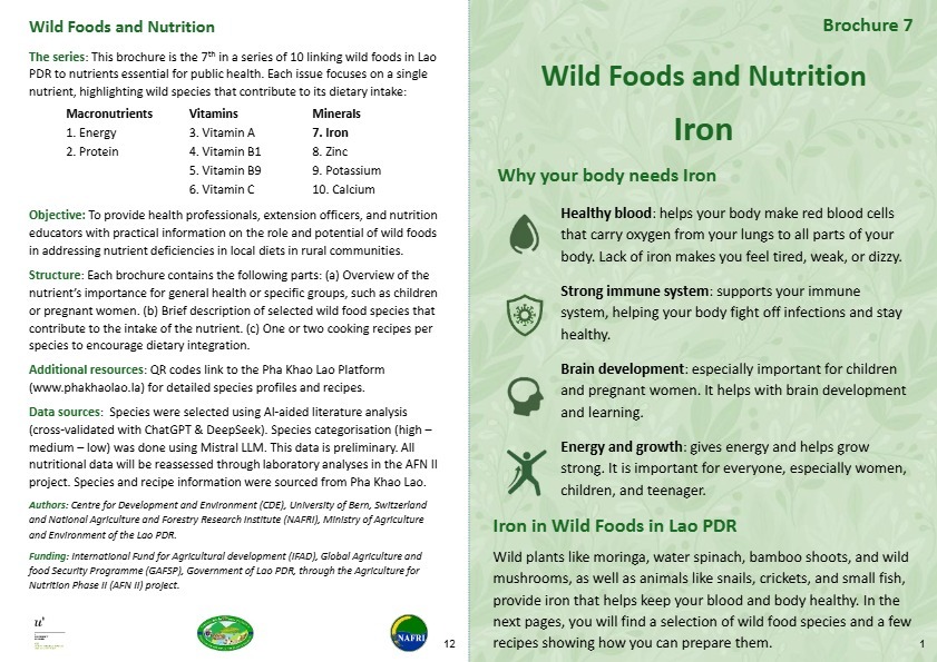 Wild plants like moringa, water spinach, bamboo shoots, and wild mushrooms, as well as animals like snails, crickets, and small fish, provide iron that helps keep your blood and body healthy. In the next pages, you will find a selection of wild food species and a few recipes showing how you can prepare them.