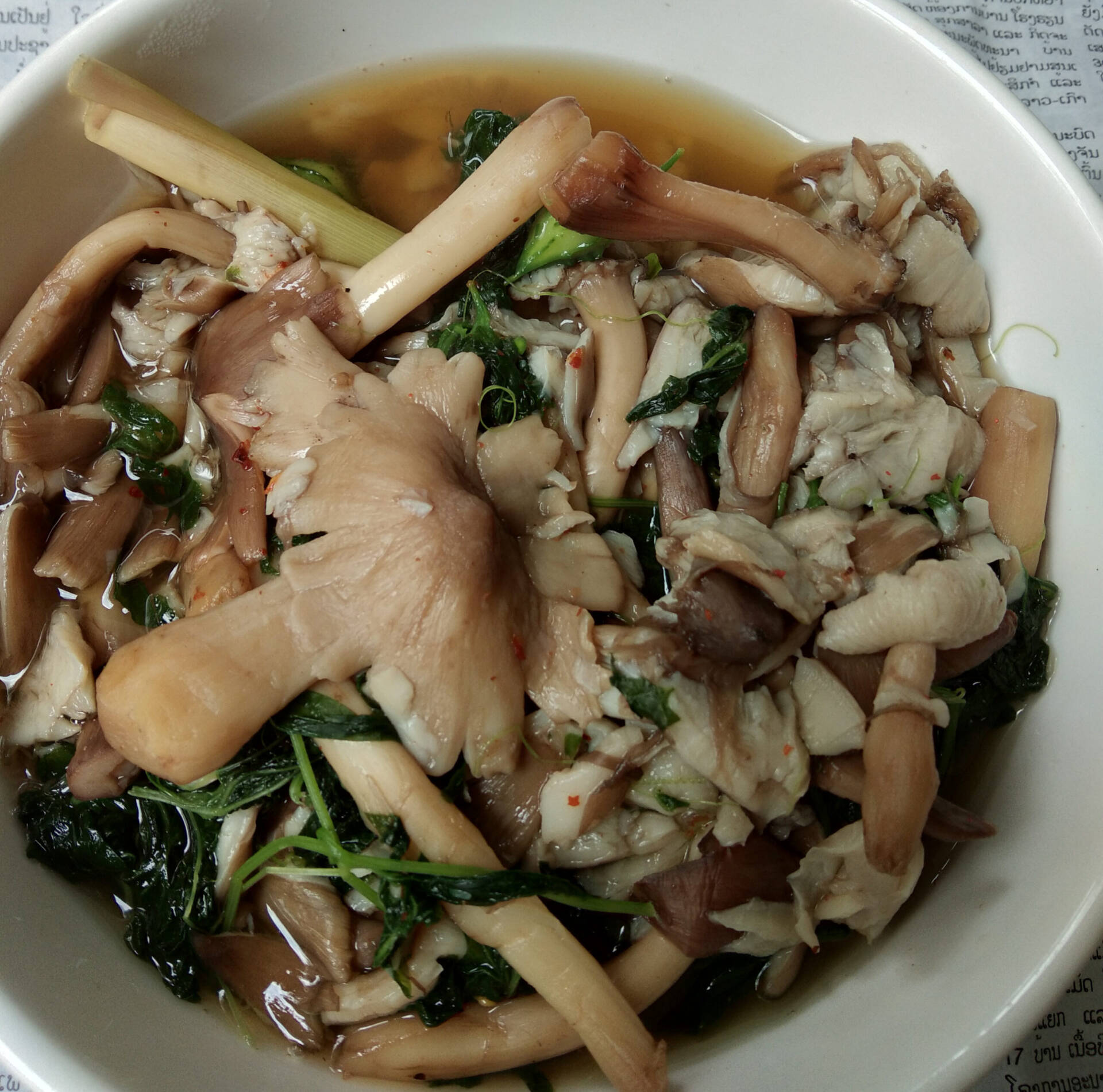 Termite mushroom (1-2 kilogram), Chilli (1-2 fruits), Lemongrass 1 stem, leaf ot balsam apple 2 bundle, pickled fish 1 teaspoon, thin soy sauce (3 T), chicken stock powder (1 t), salt (1/2t) and water 1 liter.