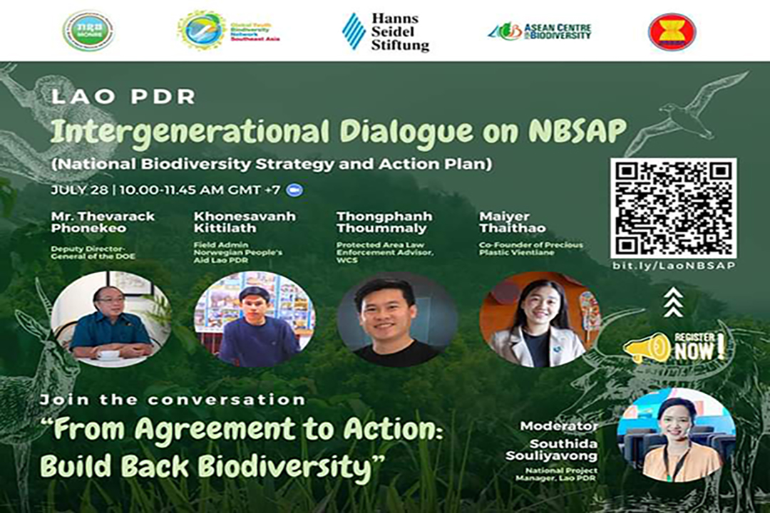 July 21, 2023ຂໍເຊີນຊວນໄວໝຸ່ມລາວ ພົບປະໂອ້ລົມກ່ຽວກັບ ແຜນການດຳເນີນງານ ແລະ ແຜນຍຸດທະສາດແຫ່ງຊາດດ້ານຊີວະນາໆພັນ (NBSAP) ຂອງ ສປປ ລາວເຫດການ