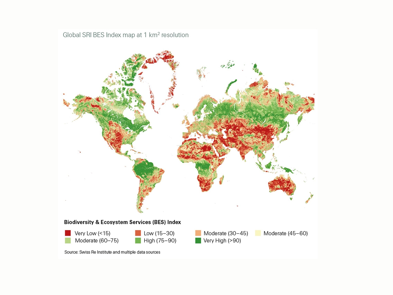 The Swiss Re index is built on 10 key ecosystem services identified by the world’s scientists and uses scientific data to map the state of these services at a resolution of one square kilometre across the world’s land. The services include provision of clean water and air, food, timber, pollination, fertile soil, erosion control, and coastal protection, as well as a measure of habitat intactness.
