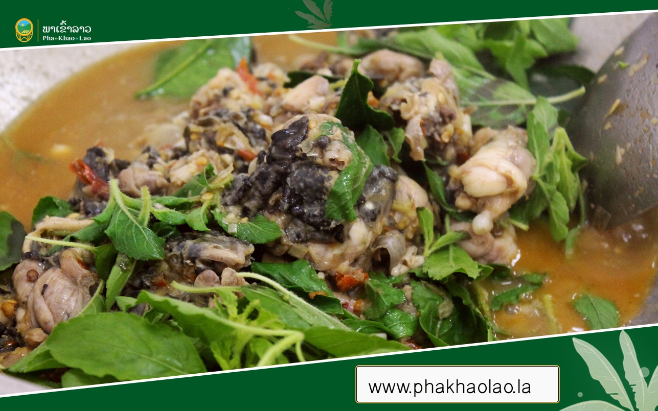 ຄົນ 4-5 ນາທີ ເພື່ອໃຫ້ກົບສຸກ, ແລ້ວໃສ່ນ້ຳ ຕາມດ້ວຍໃບກະເພົາ ແລະ ຫອມບົ່ວ
