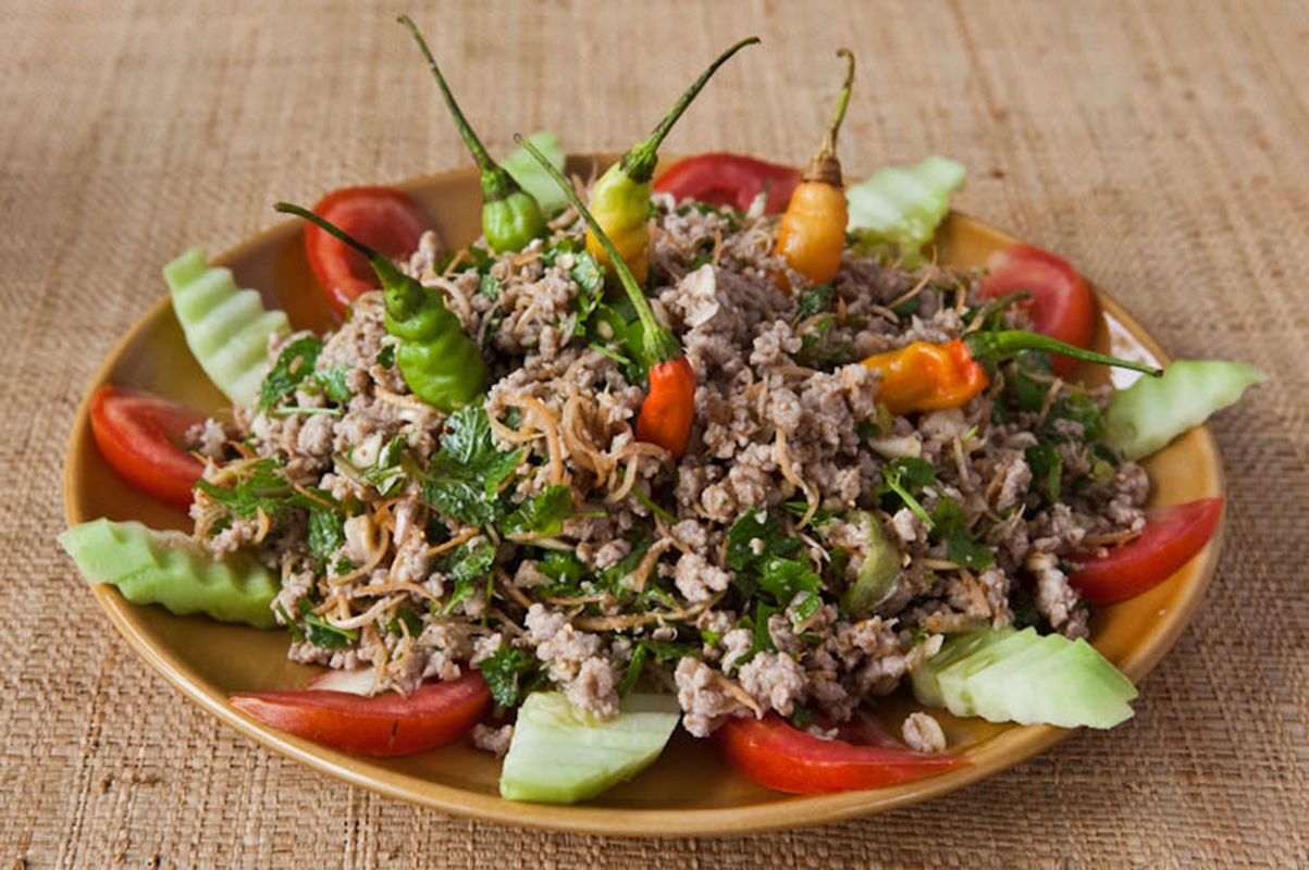 10. ຊິມ ແລະ ເພີ່ມເຄື່ອງປຸງໃສ່, ເມື່ອລົດຊາດເຂົ້າກັນແລ້ວ ໃຫ້ໃສ່ຫອມລາບ. ຕັກໃສ່ຊາມ ແລະ ແຕ່ງໜ້າອາຫານໂດຍ ໝາກເຜັດດິບ 3 ໜ່ວຍທີ່ກຽມໄວ້