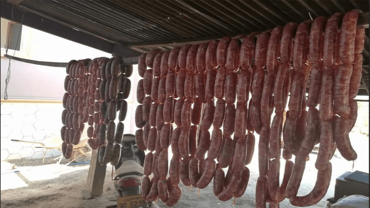 ເຮົາກະກຽມຊີ້ນຕັ້ງແຕ່ຕອນເຊົ້າ. ພວກເຮົາໄດ້ຊື້ຊີ້ນຈາກຂາປະຈຳທີ່ເຮົາໄວ້ໃຈ. ຫຼາຍປີຜ່ານມາພວກເຮົາບົດຊີ້ນດ້ວຍມື, ແຕ່ເມື່ອໄວໆມານີ້ພວກເຮົາໄດ້ເລີ່ມຕົ້ນການນໍາໃຊ້ເຄື່ອງບົດເພື່ອປະຫຍັດເວລາ. ດັ່ງນັ້ນທຸກໆມື້ພວກເຮົາກະກຽມຊີ້ນ, ກະກຽມສ່ວນປະກອບອື່ນໆທັງຫມົດ ປະສົມເຂົ້າກັນ ແລະ ຍັດໃສ່ໄສ້ໝູທີ່ທຳຄວາມສະອາດເປັນຢ່າງດີ. ຫຼັງຈາກນັ້ນພວກເຮົາຈະປ່ອຍໃຫ້ໄສ້ອົ່ວແຫ້ງ.