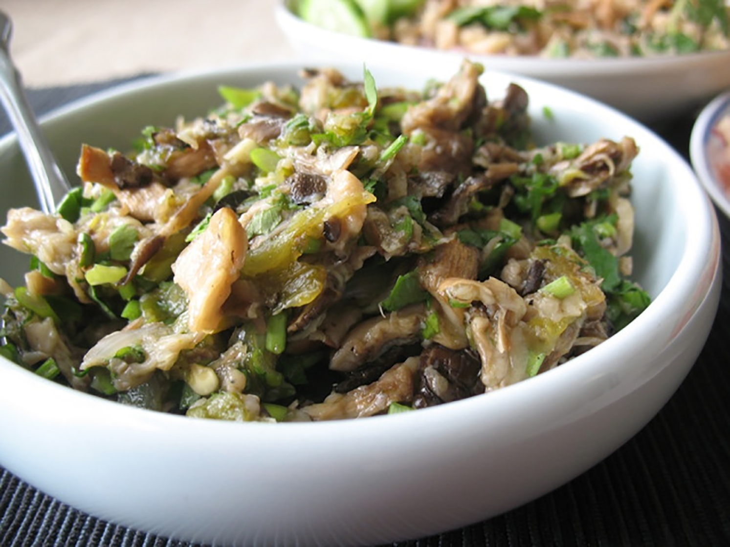 2. ໃສ່ຫົວຜັກບົ່ວ, ຜັກທຽມ ແລະ ໝາກເຜັດ ພ້ອມເກືອລົງຄົກເພື່ອຕຳ ຫຼັງຈາກນັ້ນໃຫ້ຈີກເຫັດ ໃສ່ ພ້ອມນໍ້າປາ. ຊິມລົດຊາດ ຖ້າພໍດີແລ້ວ ກໍຊອຍຜັກຫອມປ້ອມ ແລະ ໃບຫອມບົ່ວໃສ່, ຕຳອີກເທື່ອໜຶ່ງ